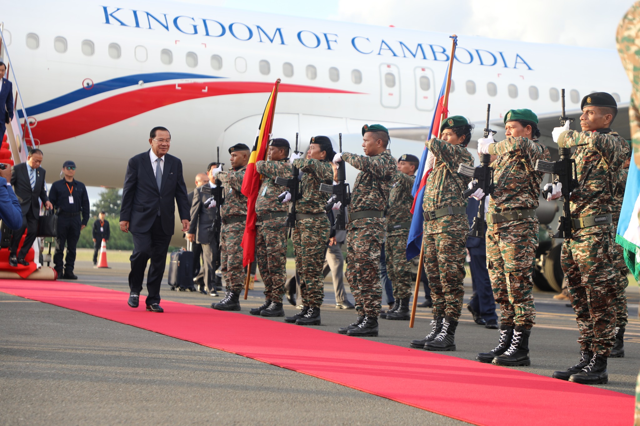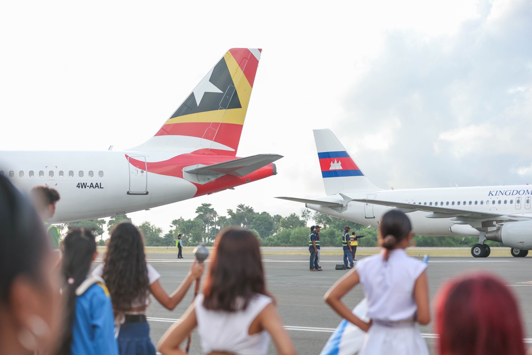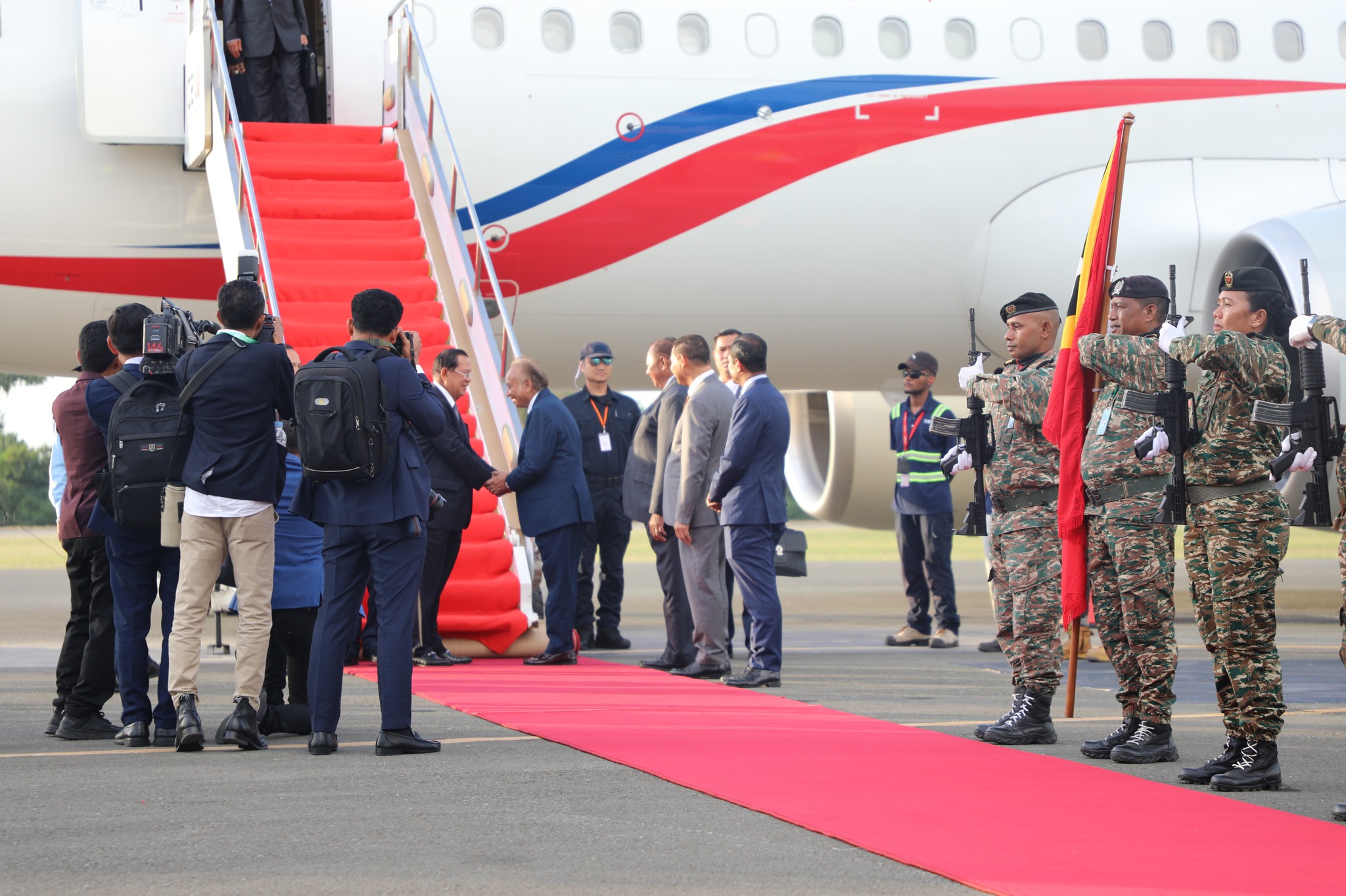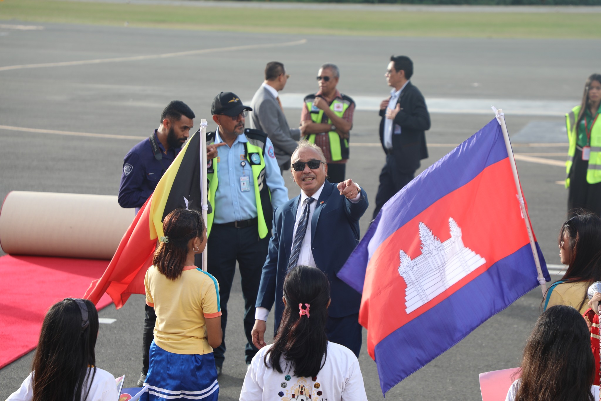 Exselensia Vise – Primeiru Ministru no Ministru Koordenadรณr ba Assuntu Ekonรณmiku, Ministru Turizmu no Ambiente, Datoโ Seri Francisco Kalbuadi Lay akompaรฑa Sua Exselensia Prezidente Repรบblika no Sua Exselensia Primeiru-Ministru inklui husi Ministru Negรณsiu Estranjeiru no Kooperasaun, Bendito dos Santos Freitas simu eis Primeiru-Ministru Kambodia atual Prezidente Senadu Reinu Kambodia nian, Samdech Akka Moha Sena Padei Techo Hun Sen ho nia komitiva sira iha aeroporto internasional Prezidente Nicolau Lobato iha Komoro-Dili, 07 Maio 2025.