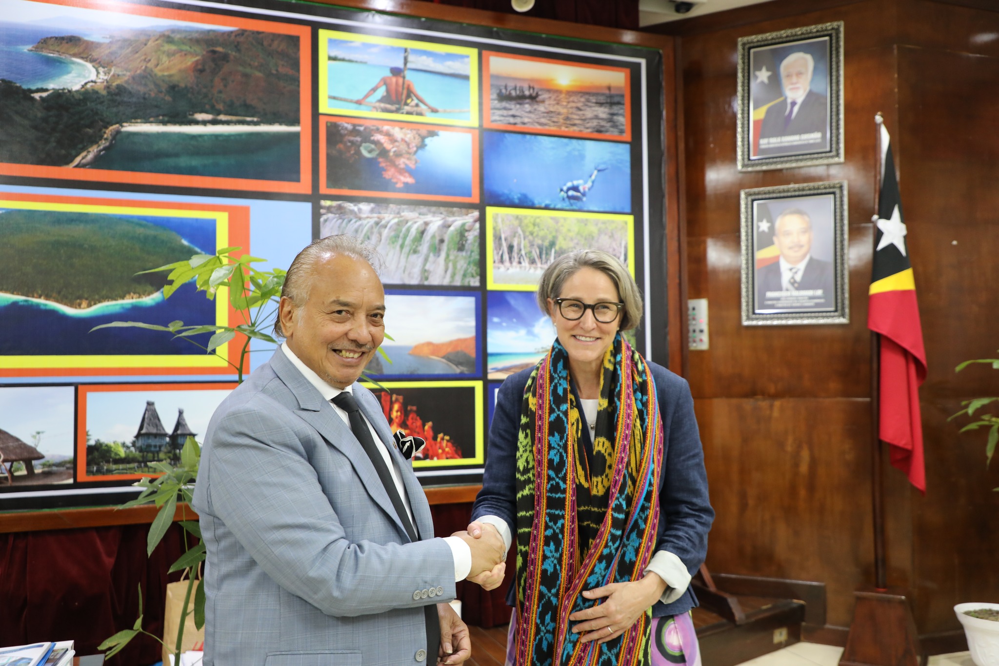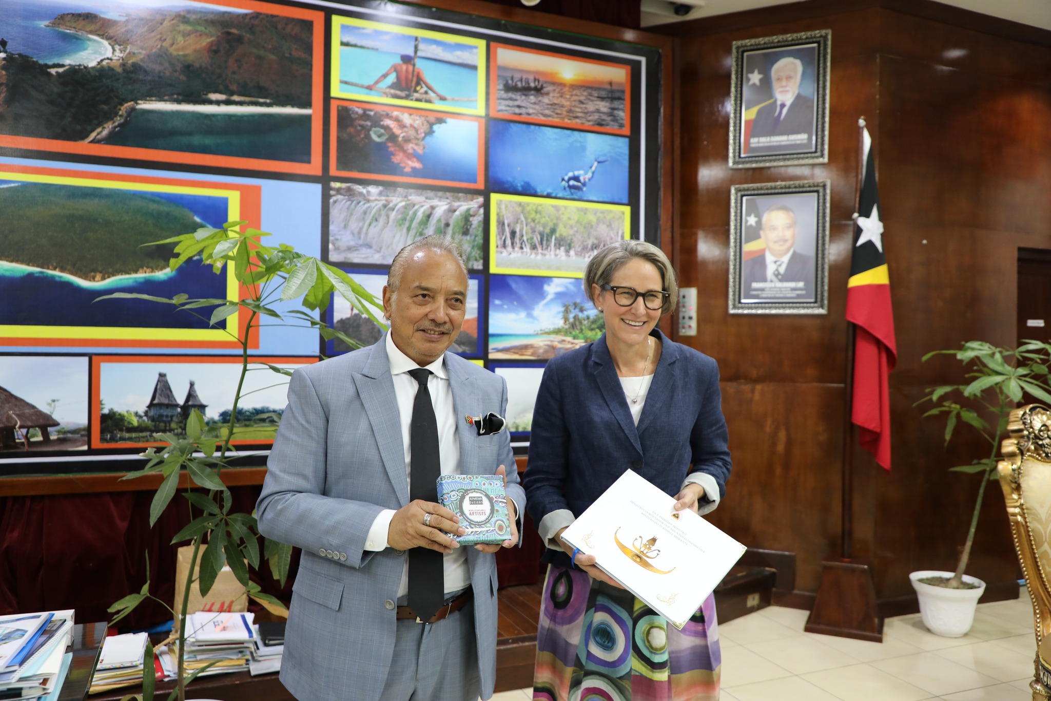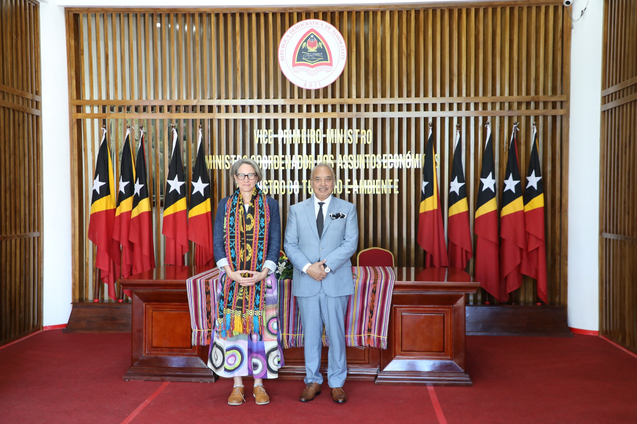 Exselensia Vise – Primeiru Ministru no Ministru Koordenadรณr ba Assuntu Ekonรณmiku, Ministru Turizmu no Ambiente, Datoโ Seri Francisco Kalbuadi Lay halaโo enkontru ho Austrรกlia nia Embaixadora ba Mudansa Klimรกtika Kristin Tilley iha Gabinete Farรณl-Dili, Tersa, 13 Maio 2025.